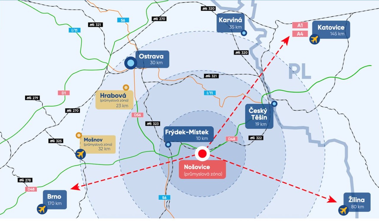 Pozemky jsou plně ve vlastnictví kraje, s napojením na klíčovou infrastrukturu a přímým přístupem na dálnici D48 (součást mezinárodní trasy E462 Vídeň–Brno–Krakov–Chotěbuz). Lokalita leží na hlavní tepně spojující Ostravu se Slovenskem a Polskem, což zajišťuje výborné mezinárodní napojení. V dojezdové vzdálenosti se nacházejí všechny druhy vnitrozemské dopravy jako silnice, železnice (č. 322) i letiště (Mošnov, Ostrava, Žilina, Katovice).
