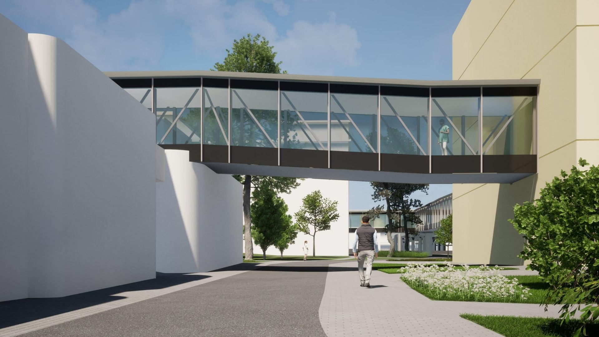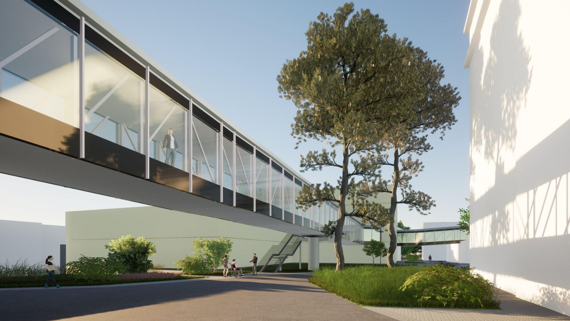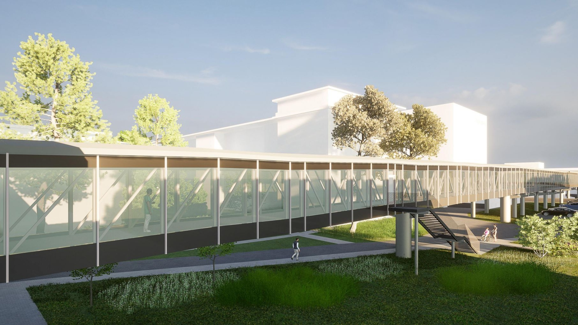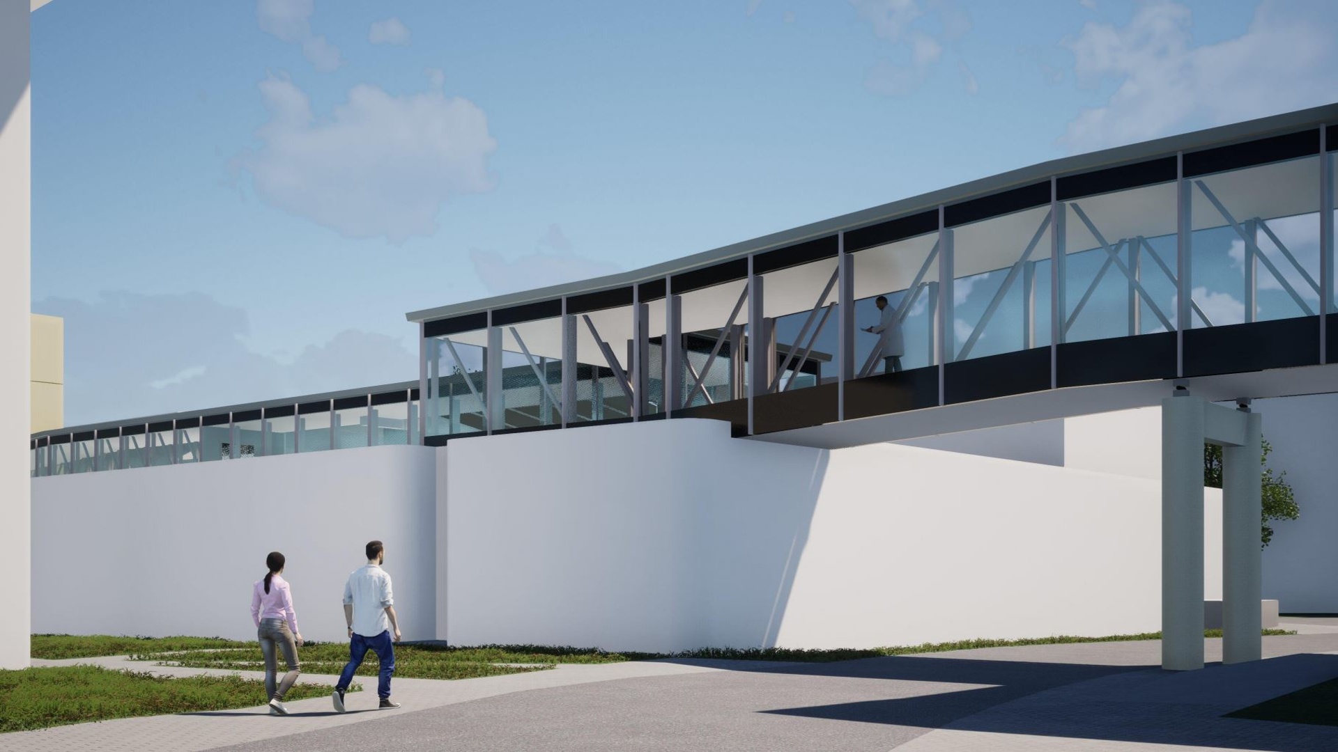 Nadzemní koridor je navržen jako lehký, v maximální míře prosklený tubus s nosnou ocelovou konstrukcí. Tvarově, materiálově i barevně bude navazovat na realizaci v 1. etapě. Primárně bude sloužit pro převoz pacientů a komunikaci personálu, avšak je možné jej využívat pro dopravu jídel v uzavřených mobilních gastro-boxech.