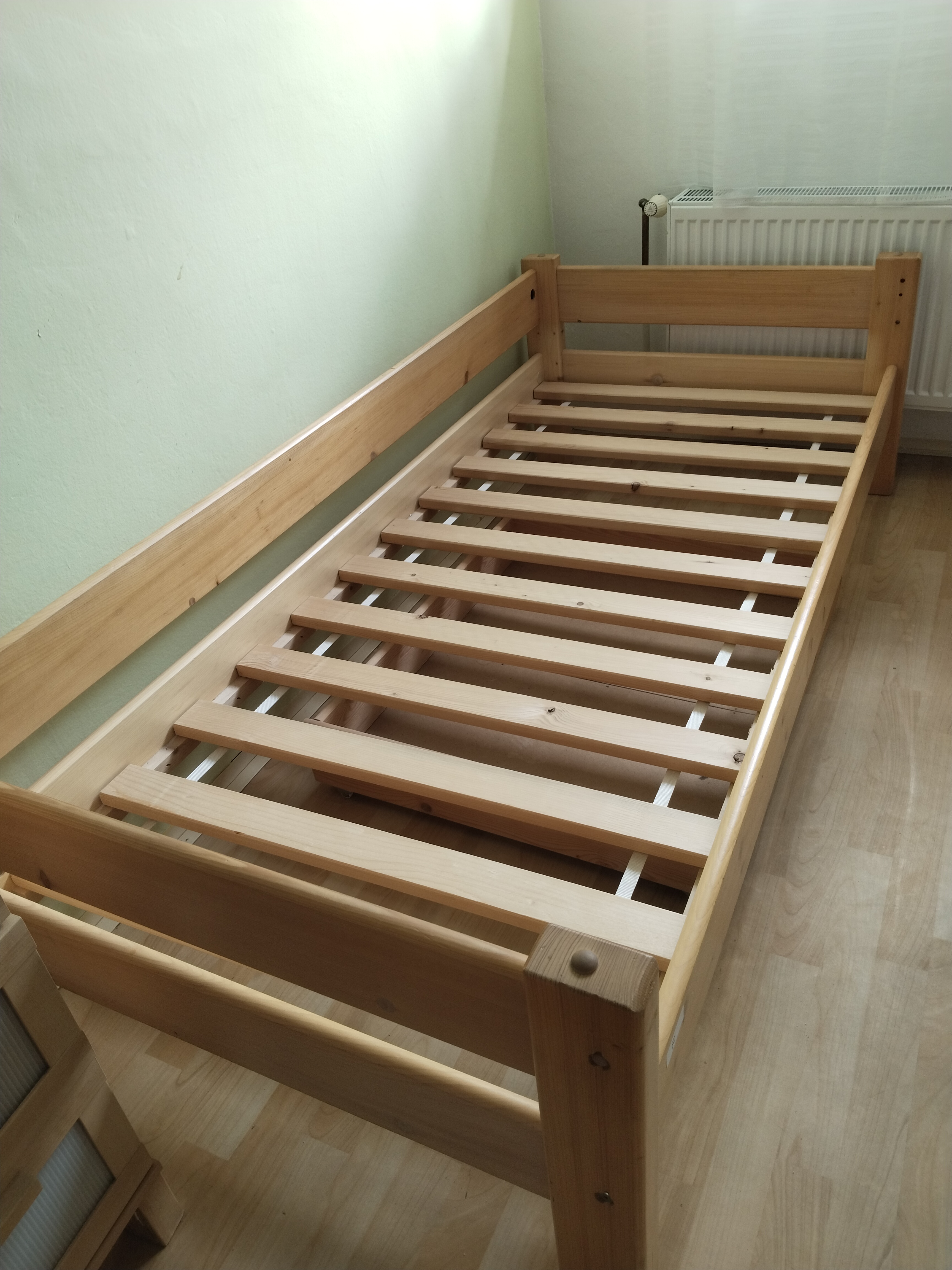Popis: Dřevěná postel s roštem, 90 x 200 cm, používaná. Celkem 12 ks, cena je za 1 ks.